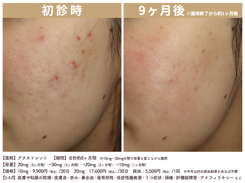 そこでまず20mgの用量で3ヶ月間アクネトレントを服用していただきましたが、改善が見られなかったため30mgに上げたところ、徐々に改善が見られました。そのまま2ヶ月間は30mgで服用を続けていただき、その後20mg2ヶ月間)、10mg1ヶ月間)と徐々に用量を減らし、8ヶ月間で服用を停止しています。