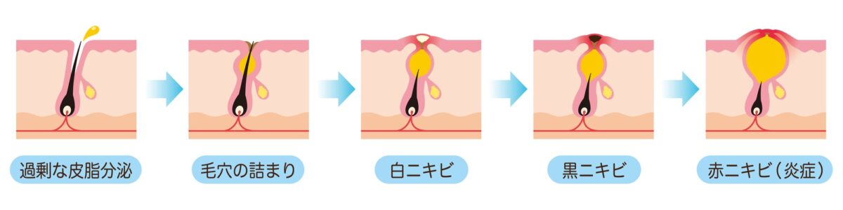 古い角質が皮脂やメイク汚れなどと混ざり合って毛穴に詰まると、毛穴内部でアクネ菌が増殖しやすくなり、ニキビの発生につながります。